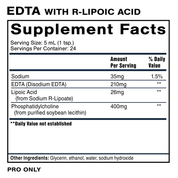 Serving Size: 1 Teaspoon Servings Per Container: 24 Disclaimer Amount Per Serving Sodium 68 mg EDTA (Disodium EDTA) 210 mg R-Lipoic Acid 33 mg Phosphatidylcholine (Soy Lecithin - 65% linoleic acid) 450 mg Other ingredients: Water, glycerin, ethanol, sodium hydroxide
